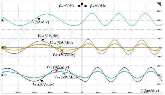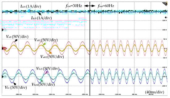 Additionally, dynamic performance experiments were conducted on the parallel FCC-CSC system, with results shown in Figure 16 and Figure 17. It can be seen that irrespective of changes in output frequency or modulation index, the proposed modulation method and FC voltage control strategy achieve robust performance. Throughout the transient process, the FC voltage can be actively controlled to half of the output voltage to prevent damage to series-connected devices due to voltage imbalance.