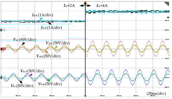Finally, experiments were conducted to validate the sub-DC bus current equalization strategy, with results shown in Figure 18 and Figure 19. These figures respectively illustrate the balance of sub-DC bus currents when varying the total DC bus current and the AC output frequency. The experimental results demonstrate that under both scenarios, the sub-DC bus currents can evenly distribute the total DC bus current with minimal error. Furthermore, it is observed that the proposed current equalization strategy does not compromise the effectiveness of FC voltage control.