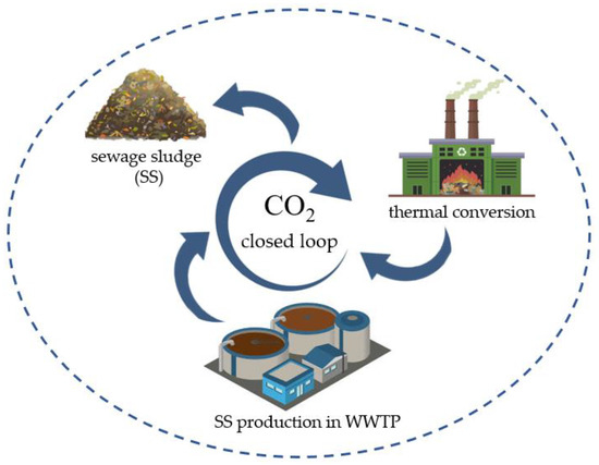 A specific type of biomass, sewage sludge (SS), is a by-product from wastewater treatment plants (WWTPs). SS is waste generated during typical treatment processes [11]. Its disposal is a significant global environmental issue. Treated sludge is frequently used as fertilizer in agriculture or disposed of in landfills and/or water bodies. However, the large quantities of sludge produced, as well as the many contaminants involved, make these options environmentally unacceptable, primarily due to the presence of a high content of heavy metals, bacteria, viruses, microplastics and pharmaceuticals. On the other hand, this specific organic waste has many beneficial properties. For example, SS is a renewable solid energy source with a higher heating value (HHV) of about 13.6 MJ kg−1 [12,13]. SS is also a source of carbon (C) and hydrogen (H2) and has the advantage of being CO2-neutral, which means that it does not contribute to increased emissions (Figure 1) [8,9]. Moreover, after combustion, the remaining ash is enriched with nutrients, including phosphorous (P) and nitrogen (N2), which can be used as fertilizer in agriculture and, in addition, the high volume of SS is also reduced. The increasing output of SS in recent years, along with the limitations of current disposal methods, emphasizes the need to find alternative ways to manage this organic material. European legislation prohibits the deposition of SS into landfills or water and imposes limits on the content of heavy metals when SS is introduced into soils. The latest trends in the field of biomass and renewable energy highlight the potential for SS as a “green fuel” and promote the use of its potential. According to Eurostat data, in each year since 2021, more than three megatons of sludge from urban WWTPs were produced in the EU [14]. Even though 20% of SS is incinerated, followed by composting (21%), and 10% is landfilled, approximately 29% is still disposed of in agriculture [15].