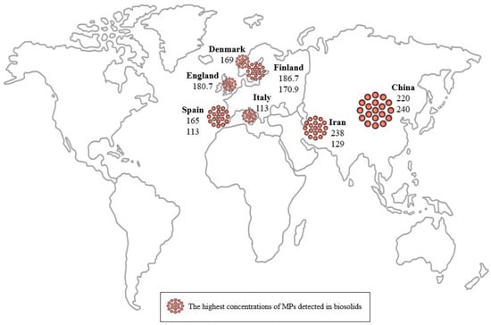 In brief, 53 studies containing 63 samples from numerous countries around the world were investigated. The sizes of the identified polymer particles were very different, ranging from 0.45 to 5000 µm. It was noted that MPs content was most commonly tested in dewatered SS. The largest amount of MPs in this group was detected in China. According to two independent studies, in dewatered SS, 240 particles g−1 within the size range of >20 µm and 220 particles g−1 within the size range of 8–1000 µm were found. In dried, dewatered sludge originating from Spain, more than 100 particles larger than 29 µm were found. A high level of MPs contamination was also obtained from anaerobically digested SS samples originating in England (180.7 particles g−1, size > 50 µm) and digested, dewatered and dried SS from Finland (170.9 particles g−1, size > 500 µm, and 186.7 particles g−1, size > 20 µm, respectively).