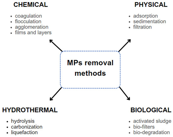 The persistence and durability of MPs makes them difficult to remove from wastewater and SS. In general, a larger size and a lower polymer density ensure better and more efficient MPs removal during traditional wastewater treatment processes [98]. Although WWTPs are not designed to remove such particles, they are eliminated to some extent, along with other solid particles during treatment [22,35]. Many studies have followed the fate of MPs during conventional wastewater treatment processes, but the results vary considerably. This is due to the complex interaction of factors related to the differences in WWTP designs, operational and environmental conditions, human factors and the temporal variability of effluent, as well as sampling and analytical methods and MPs characteristics [133]. The primary treatment employs physical methods, such as screening and sedimentation, to remove larger debris, including some MPs attached to larger fractions. The secondary treatment, through biological processes such as activated sludge and biofilm reactors, further reduces the MPs content by incorporating these particles into biological flocs [115]. Advanced treatment technologies, such as membrane bioreactors, are used to filter out MPs through fine membranes. Additionally, chemical treatments, e.g., coagulation and flocculation, aggregate polymer microparticles into larger, more easily removable clusters. Other, non-typical tertiary treatments, e.g., sand filtration and the dosing of granular activated carbon, provide a final purification step, ensuring minimal MPs presence in the treated effluent. By integrating these processes, the discharge of MPs into the environment by WWTPs can be significantly reduced. Current methods for removing sewage-derived MPs from conventional urban WWTPs can be generally divided into physical, chemical, biological and hydrothermal methods, and they are listed in Figure 6. According to R. Ahmed et al. (2022), physical methods can remove about 40–99% of the MPs from wastewater, with an emphasis on adsorption as the most effective process [159]. The removal rates of chemical processes are very uneven, ranging from 8–98%, although the coagulation–flocculation mechanism provides the best results. Biological processes can generally remove 17–79% of MPs, although biofilters are the most effective methods [159].
