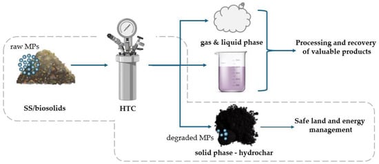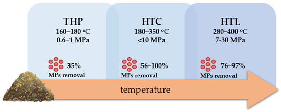 Considering the removal of MPs from SS, it has been proven by Xu Z. et al. (2023) that the conventional thermal drying of SS contributes to the fragmentation of MPs and, consequently, increases the environmental risk [153]. Therefore, there is a need to develop technology that not only breaks MPs into smaller particles, but also degrades them effectively. In terms of the effective management of SS, there is a growing interest in hydrothermal reactions, such as thermal hydrolysis pretreatment (THP), hydrothermal carbonization (HTC) and hydrothermal liquefaction (HTL). There are some reports that confirm MPs degradation during hydrothermal SS processing.