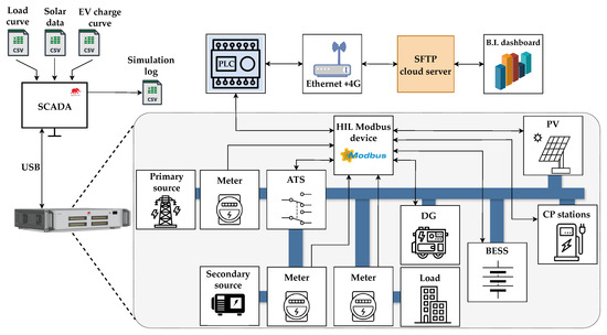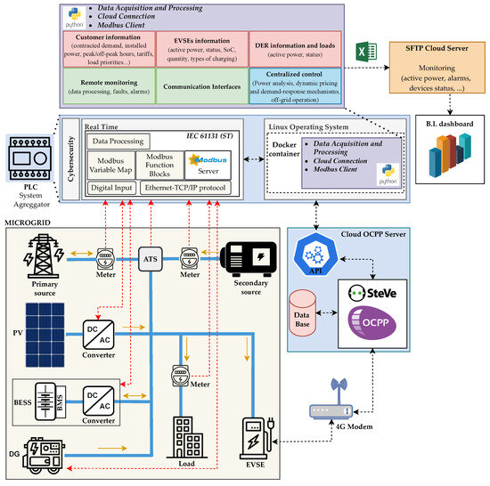 In this context, the PLC is responsible for acquiring and monitoring data from energy meters, EVSE and DERs: battery energy storage system (BESS), with a Battery Management System (BMS), Photovoltaic (PV) and Dispatchable Generator (DG). Moreover, the PLC is also used to establish the parameters and restrictions for energy consumption and energy generation.