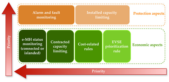 It is also important to establish the inner-group priorities. For the protection group, alarm and fault monitoring have more priority than installed capacity limiting even when e-MH is islanded, given its importance in case, for example, of a failed protective device. Similarly, considering the economic aspects group, the e-MH status monitoring is the rule with higher priority, followed by contracted capacity limiting, cost-related rules and EVSE prioritization rule. This hierarchy seeks to balance economic aspects, operation reliability and yet to allow charge prioritization. The following sections give a detailed view of each of the functionalities.