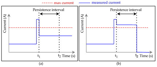 Activation criteria for alarm 1. (a) Overcurrent occurrence followed by current reduction (after CP power decrease); (b) Persistence of overcurrent followed by CP shutdown.