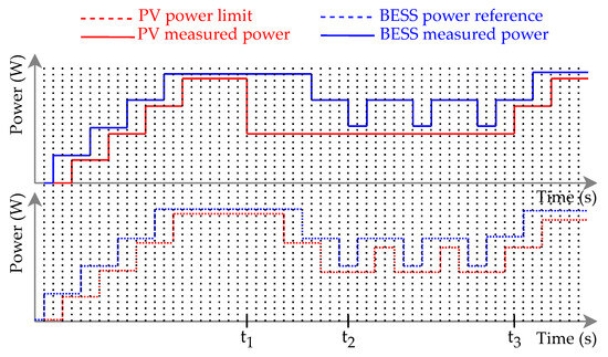 In the example given in Figure 5, after , the controller starts increasing the BESS reference again. Once BESS power becomes close to the reference power, the PV generation limit is incremented again to check if the PV can increase its generation. However, unlike the condition before , the PV power does not increase because the solar irradiation is still low. After this moment, the PV generation limit is decremented again, followed by a decrement in the BESS reference. In this way, the controller always checks if there is enough PV generation to recharge the BESS, assessing if the power generated by the PV is following the power measured in the BESS as desired. This check is conducted by periodically increasing the BESS power reference followed by an increase in the PV generation limit, as shown between the intervals and .