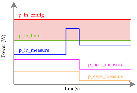 The power limit acts as a safety margin to prevent from reaching values close to the contracted or installed capacity. However, it is important to highlight that this margin does not guarantee that input power will never exceed the limits in transient situations since it depends on factors such as the value chosen for , load variation and communication delay for the measurements. The appropriate choice of should be evaluated based on the e-MH characteristics, considering its responsiveness to load variations.
