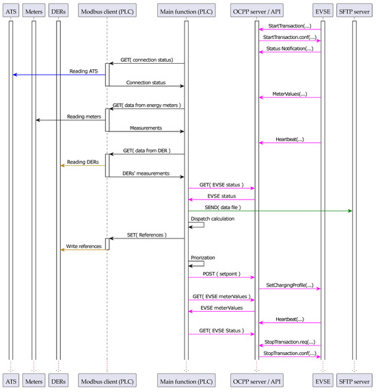For the operation, the PLC communicates with two cloud-based servers: the OCPP server and a SFTP server (from Secure File Transfer Protocol). The communication between EVSE and the controller does not depend on the RT functions, as observed in Figure 2. This communication is handled by the OCPP server, which is, in fact, a SteVE instance. SteVE (name derived from Steckdosenverwaltung, socket administration, in German) is a Java-based software distributed under a general public license (GPL). Its development started at the RWTH Aachen University in 2013 and its aim is to support the deployment of electric mobility [19]. This software package contains all major functionalities described in the OCPP protocol, hence, allowing the remote control of EVSE as well as authentication and transaction-related data storage. SteVE also has an adjacent API implemented, which will be extended in order to allow requests to be made automatically by the PLC, using a 4G modem.