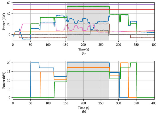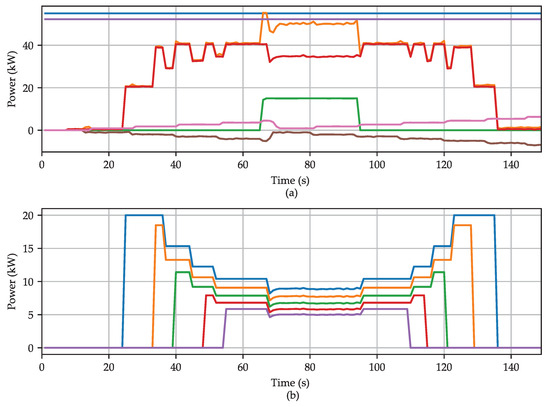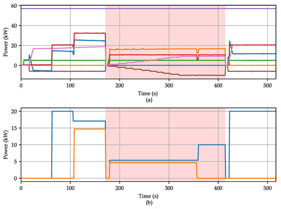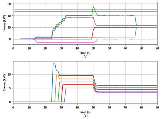 Five EVs were simultaneously connected to the CP (seen in Figure 13a), while BESS was kept in slow charge mode, which elevates overall consumption to 40 kW, as observed in Figure 13a. In order to provoke the limit to be surpassed, at 49 s, the local load is connected to the e-MH, rapidly increasing the power drawn from the grid. When the e-MH power consumption surpasses the input power limit set in the consumer unit parameters, the proposed controller stops charging the BESS and reduces the power allowed to the CP to about 24 kW. Consequently, all EVs have their power limit reduced while the prioritization order is maintained, as shown in Figure 13b.