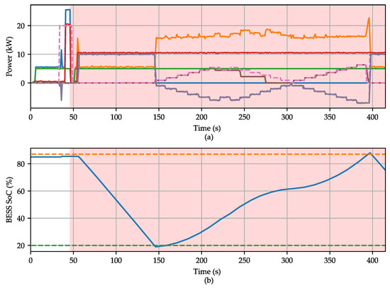 Once more, at the beginning of the test, an EV is connected to the CP. After 45 s, islanding occurs, stopping all operations for a few seconds. When ATS switches to the secondary source, the EV charging operation is resumed, drawing 10 kW from the secondary energy source. Since the BESS is initially fully charged () and PV generation is not considered on CP power calculation, the PV generation limit is kept at zero, avoiding undesirable generation surpass. The controller also sets the BESS reference to discharge mode in order to reduce the power drawn from the secondary source, which is reduced from 10 kW to 5 kW, as shown in Figure 12a.