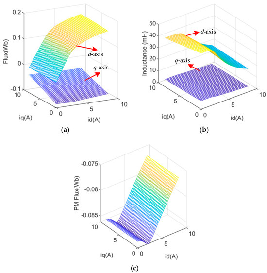 Flux characteristics of the PMa-SynRM: (a) d- and q-axis flux with different d- and q-axis currents; (b) d- and q-axis inductance with different d- and q-axis currents; and (c) permanent magnet flux with different d- and q-axis currents.