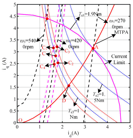 The current limitation and voltage limitation curve were shown in Figure 2. The values ω1, ω2, ω3 represent the voltage limitation in different speeds, and ω1 < ω2 < ω3. Below the base speed, the current control is maintained on the trajectory of the OA segment, which can ensure minimum copper loss and maximum efficiency. As a result of the cross-saturation, magnetic saturation, and the changes in inductance parameters of the machine shown in Figure 1, the MTPA curve for the OA segment is no longer a straight line. Point A is the rated operating point of the machine. Limited by current and voltage, to obtain a higher speed, the current trajectory needs to move along the AB segments to achieve the higher speeds of ω1, ω2, and ω3. Consequently, it is necessary to reduce the d-axis current and increase the q-axis current.