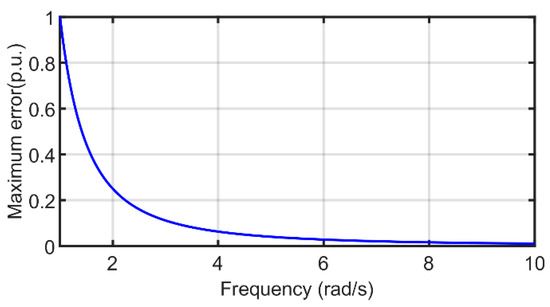 According to (14), the maximum estimation error of the ESO is proportional to h0 if the bandwidth ω0 is fixed. Therefore, the ESO is highly dependent on h0 for its estimation accuracy. A higher cut-off frequency can reduce the observation error, but it also amplifies noise and is more sensitive to high-frequency noise. Due to this, in practice, it is necessary to adjust the cut-off frequency ω0 to maintain an acceptable level of error, noise, and response time. Figure 3 shows the relationship between the maximum error and frequency.