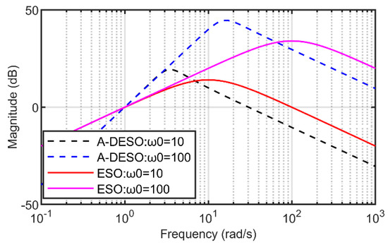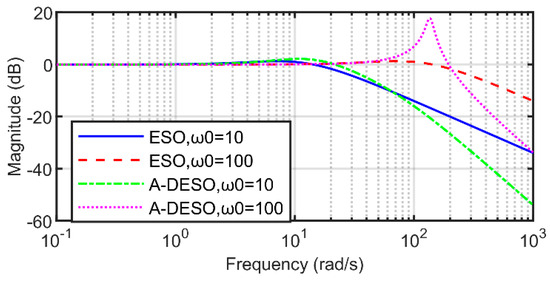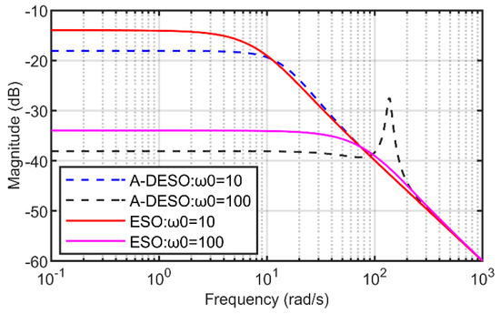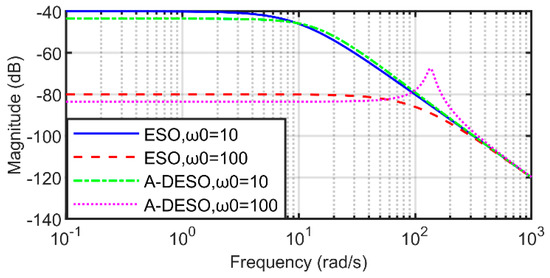 Figure 9 shows the frequency responses of the noise suppression ability for the disturbance caused by the speed calculation under the same ω0. The noise suppression performance is better for the A-DESO than for the ESO at high frequencies when using the same ω0. On the other hand, to approach the same disturbance estimation performance, ω0 should be smaller for the ESO than for the A-DESO. In many practical systems, torque inputs are often low frequency and unmeasurable noise signals are often high frequency. The A-DESO provides a way to achieve disturbance rejection and noise attenuation simultaneously.