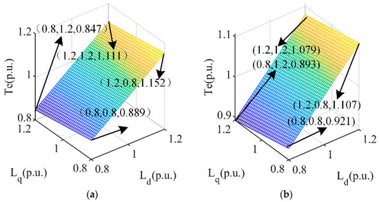 As described in Figure 1, different colors represent the different values of inductance and flux, respectively, in which yellow represents the saturation region. The flux along the d- and q-axis could also be used for further verification. In (a), as the current increases, the flux linkage gradually decreases and tends to remain unchanged, which means that the magnetic saturation greatly influences the flux and inductance. The change in q-axis inductance has the same trend as the change in d-axis inductance.