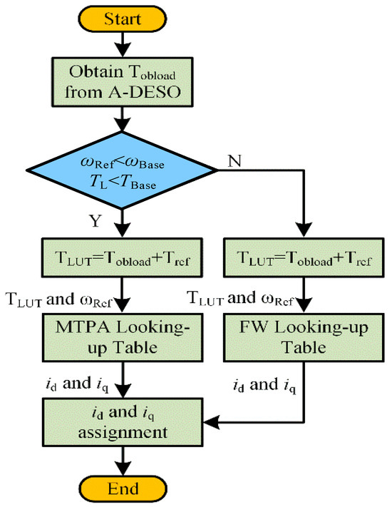 If either condition is not met (N), the algorithm calculates TLUT and uses it along with the speed reference to look up values in the FW table. The id and iq currents are then determined from this table and assigned.