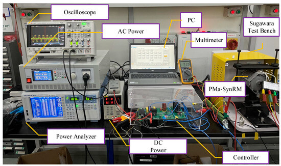 Experimental tests were carried out in this paper in order to verify the feasibility of the algorithm. Figure 18 illustrates the main experimental platform, which mainly consists of the Sugawara test bench for loading and unloading. The YAKOGAWA power analyzer is used for the three-phase voltage and current data acquisition. Meanwhile, oscilloscopes were mainly used to measure voltages and currents. For the converter part of the board, AC power was used, whereas DC power was used for the control part. The STM32F303 microcontroller (STMicroelectronics, Geneva, Switzerland) was used to achieve the proposed algorithm and the maximum peak current of 15 A can be satisfied with the help of the STG series IGBT.