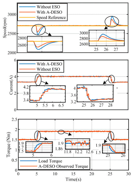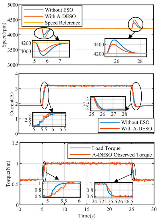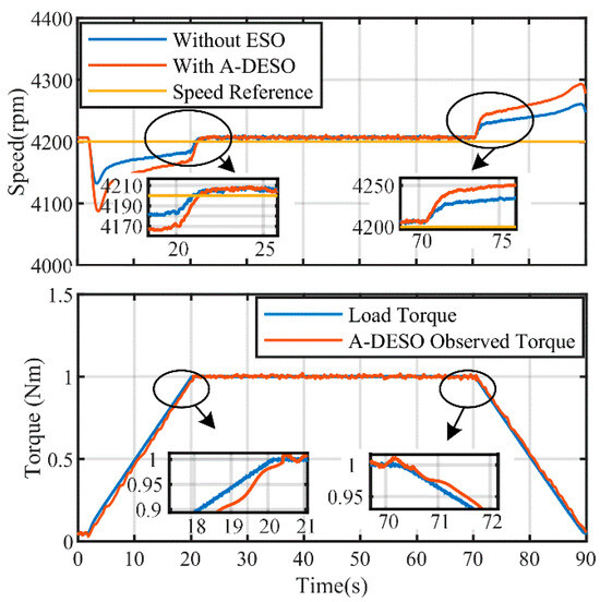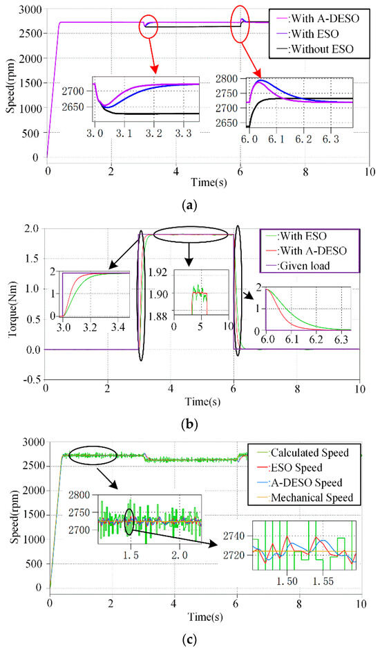 From the no-load condition to the rated-load condition and opposite operating mode, this group of simulations verified the speed fluctuation. Figure 19 illustrates the change in speed associated with a step load from 0 Nm to 1.9 Nm at t = 3 s and a step load from 1.9 Nm to 0 Nm at t = 6 s. From the simulation, the machine speed experiencess a steady-state error for 74 rpm for a long convergence time while the A-DESO and the ESO experience a 23 rpm steady-state error and the steady-state error is maintained for a considerable period. Meanwhile, the A-DESO shows a better speed dynamic response compared to the ESO part from (a). The same results can be obtained when a step load occurs from 1.9 Nm to 0 Nm. It can be summarized that the A-DESO has a better speed response performance compared to the ESO and a smaller steady-state error compared to the no-ESO simulation part.