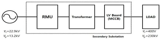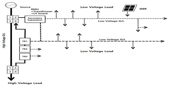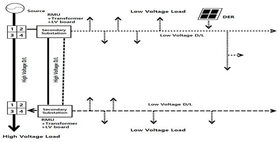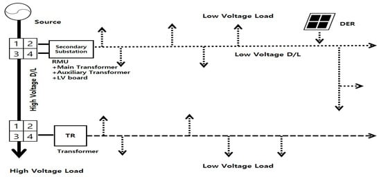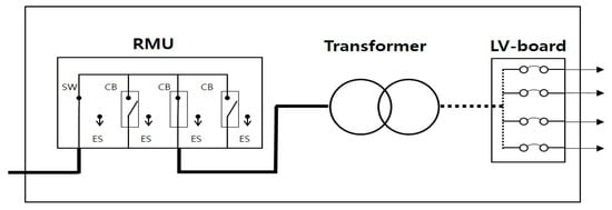Figure 4 illustrates the configuration of the S-substation where the RMU method is applied. The S-substation is not connected to the main D/L connected to other D/Ls or the HV Loads but only to the branch D/L. This S-substation has an RMU, a transformer, and an LV board in the same underground structure [].