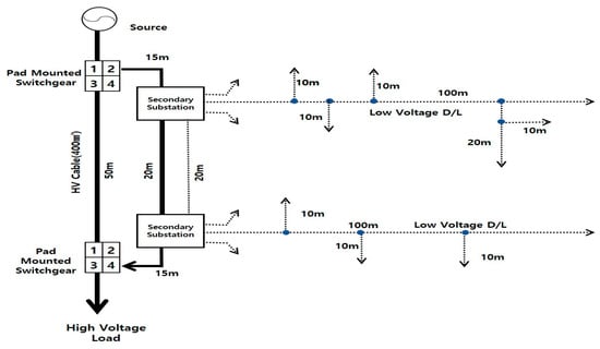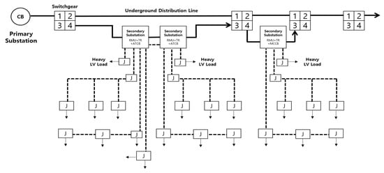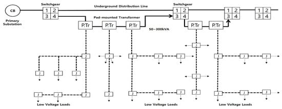In this figure, solid lines indicate HV D/Ls, whereas dotted lines represent LV D/Ls. The switchgear mainly uses four circuits, and the HV D/Ls comprise an open-loop system. Conversely, the LV D/Ls connected to the transformer are connected in a radial system. Figure 3 illustrates an example of a system currently operating as an underground distribution system in Korea. In the system shown in the figure, LV systems of pad-mounted transformers are operated independently. Thus, when a transformer experiences a fault, it is impossible to connect the LV distribution system to other transformers. As a result, LV customers may experience prolonged power outages until the transformer is repaired [].