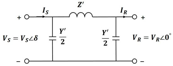 Figure 8 depicts the distribution system as a π-type equivalent circuit, with and representing the sending-end voltage and current and and representing the receiving-end voltage and current. denotes the total series impedance, while represents the total shunt admittance. Additionally, δ represents the voltage-phase angle between the sending and receiving ends. From the above equations, it can be seen that, in AC, the active PFs come from the point where the phase is leading to the point where it is lagging []. In MATLAB/SIMULINK, the slack value is typically set as 1∠0, so the load side can be expected to come out as a negative value.