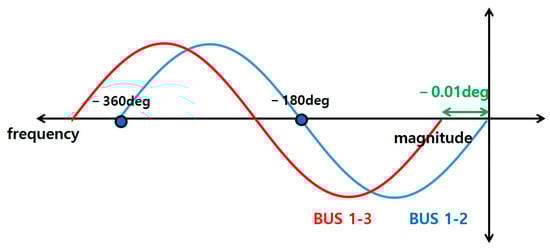 Figure 9 illustrates a waveform for active power. For example, if the phase angle at Bus 1-2 is 0 deg but there is a difference of −0.01 deg in Bus 1-3, which is the subsequent load, it would be necessary to verify whether power is supplied after a few seconds.
