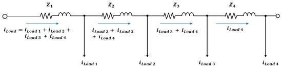 The voltage is expressed as a PU value and the specified voltage maintenance range must be 0.855 [pu] or higher; however, when connected with heavy LV loads at the end of the D/L, there is a significant voltage drop from Bus 1-3/2-3, making it difficult to maintain Power Quality (PQ). When heavy LV loads are directly connected to the transformer, the specified voltage is maintained (0.855 pu) in all buses. In contrast, when connected to the end of the D/L, it is observed that the voltage drops rapidly from Bus 1-3. In the case of a separate line configuration, Bus 1-2 is configured as a bus on a separate line rather than on the existing line. The simulation results indicate that the optimal arrangement is to connect heavy LV loads directly under the transformer’s secondary side. The transformer’s secondary side current and voltage drop can be expressed using the following formula.