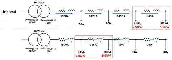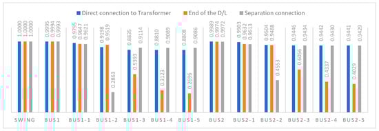 For optimal load placement, this paper analyzes how the voltage drop changed for three cases: ① direct connection to the transformer, ② end of the D/L, ③ separation connection. To calculate the voltage drop for each of the three cases, the configuration in Model A is modified in the proposed system types. The first case is that heavy LV loads (250~500 kW) are directly connected to the transformer’s secondary side (directly under the transformer), and the second case is that the heavy LV loads are connected to the end of the D/L. The third is separately connected to other LV loads. Additionally, in the third case, the branch D/L is long, so the line impedances are set to be large []. Figure 12 describes the simulation results.