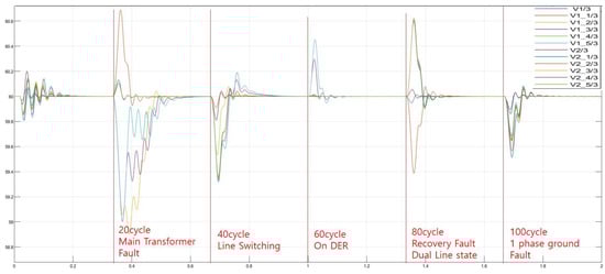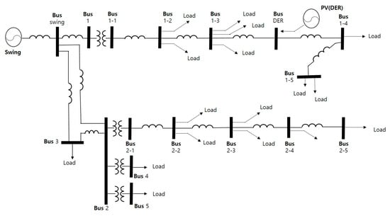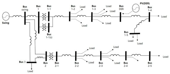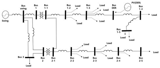 Figure 13 shows the equivalent circuit of Model A, and Table 2 lists the results of PF when it is operated in a normal state (steady state) without any fault or conversion. As shown in Table 2, it can be observed that there are cases where it does not reach standard 1 [PU]. In this simulation, since the transformer’s secondary side is set to 380 V, if it is 0.8808 of Bus 1-5, which is the lowest value, 380 × 0.8808 = 334 V, which is lower than the standard voltage range; however, since the actual transformer supplies the secondary at 400 V, it can be seen that it is necessary to maintain up to 342/400 V = 0.855 [PU] to maintain 342 V (380 ± 38 V), which is the minimum standard voltage. That is, the simulation results show that the load connected to each BUS is receiving power within the standard voltage range. To compare the PF results for the three models, it is necessary to examine not only the steady-state operation (Normal state) but also the operating conditions under other scenarios. In this paper, we review the following conditions: (1) Normal state, (2) Line switching, and (3) Dual Line. Additionally, changes in voltage and phase due to the connection of DERs are compared.