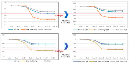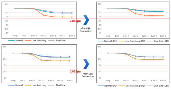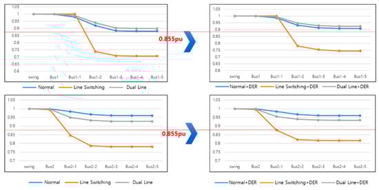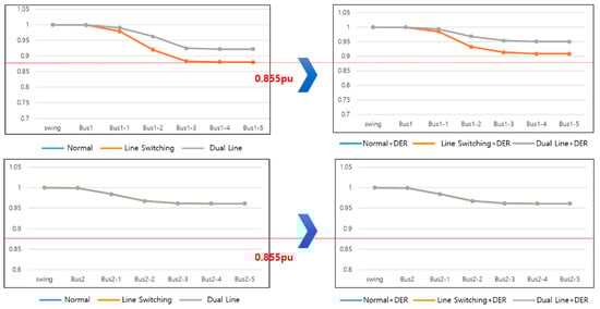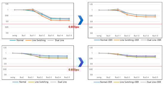 The upper graph shows the voltage value for each bus for line No. 1 to which the DER is connected, while the lower graph shows the voltage value for each bus to which the DER is not connected. The simulation for the second type of Line Switching sets the route where the power supply of the transformer supplying line 1 is cut off, so it can be confirmed that power is supplied when it is supplied from the transformer of line 2 after the power is cut off, but the voltage drop, in this case, is very large. Although the power in line 2 is not cut off, it can be confirmed that loads of line 2 are also affected because it also divides the line 1 loads. The graph on the right of the upper/lower graph shows how the voltage changes when DER is connected. It can be seen that the voltage increases when DER is applied to both lines 1 and 2. In this paper, the DER is configured to 99 kW. If additional DERs are connected, the voltage drop can be further compensated.