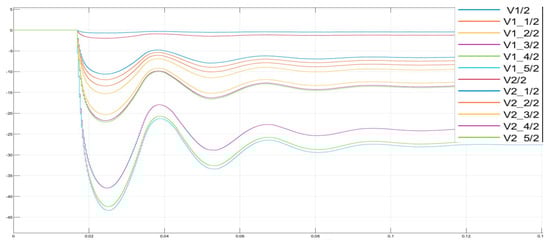 As shown in the table and graph, if we compare buses 1-2 and 2-2 with buses 1-3 and 2-3, it can be seen that the phase is significantly left behind. This is because heavy LV loads are connected to the 1-2 and 2-2 buses, and the phase from the next bus is delayed; that is, when heavy LV loads are connected, it can be seen that the flow of the current is delayed.