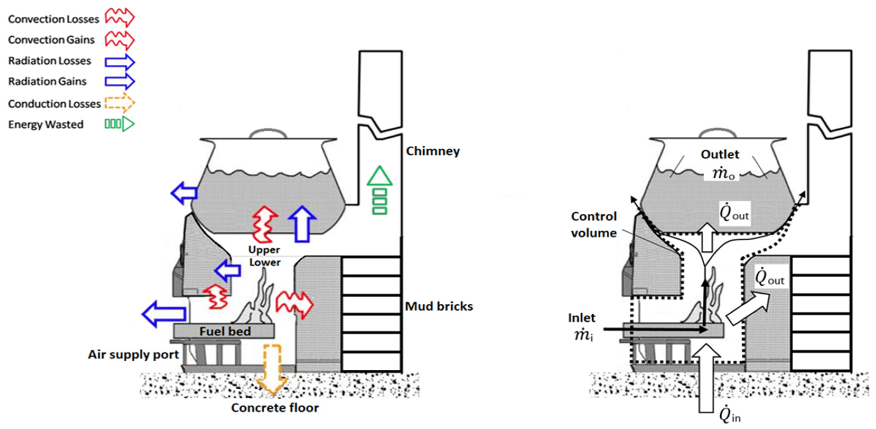 - The maximum energy gain was achieved by radiation to the pot from the high flames and radiation transfer to the pot from the fuel bed followed by convection to the pot bottom and convection to the pot sides, respectively.