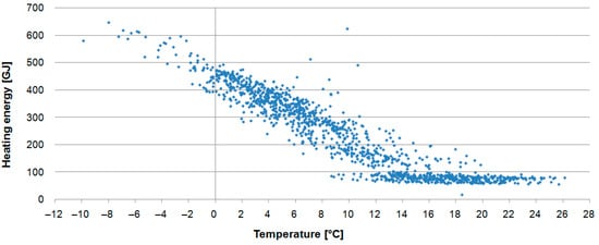 Figure 3 presents the relation between daily heat demand and ambient temperature for the whole analysed period. During the warm season, when buildings connected to the considered network are not heated, there is almost constant heat demand (below 100 GJ),which can be attributed mainly to tap water and small commercial consumers.