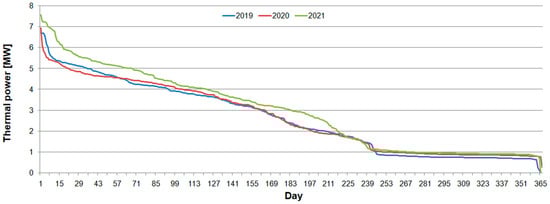 Peak thermal power was 7.6 MW, 7.0 MW and 6.7 MW in 2021, 2020 and 2019, respectively (Figure 4). Despite differences in daily values, the presented heating power duration curves are very similar. Space heating of buildings lasted for about 2/3 of the year, until the 240th day.
