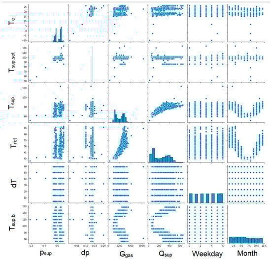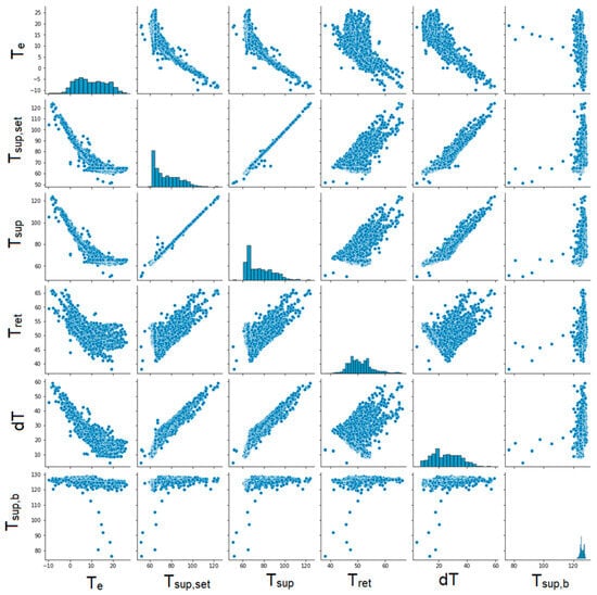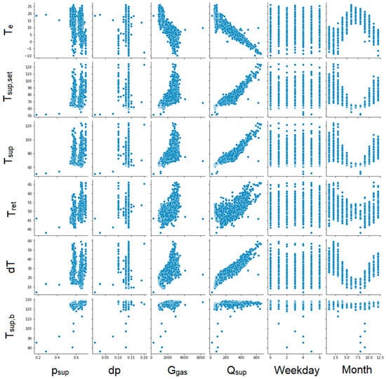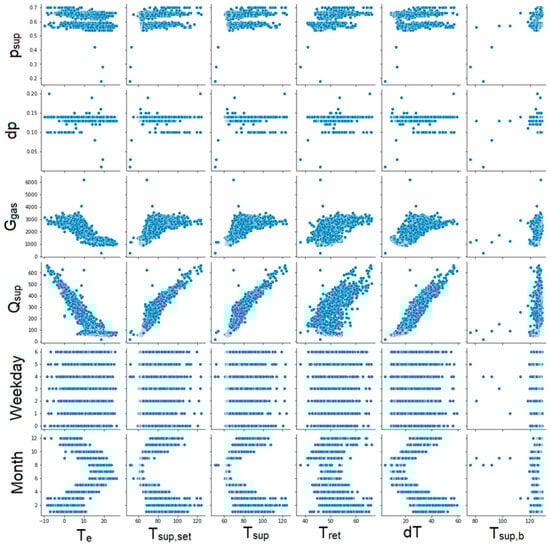 The next step was to create graphs for each pair of parameters to illustrate the correlation between them (Figure 6, Figure 7, Figure 8 and Figure 9). Unfortunately, some of the graphs show that some data are redundant. For example, as the supplying and return temperatures were available, there was no need to use their difference.
