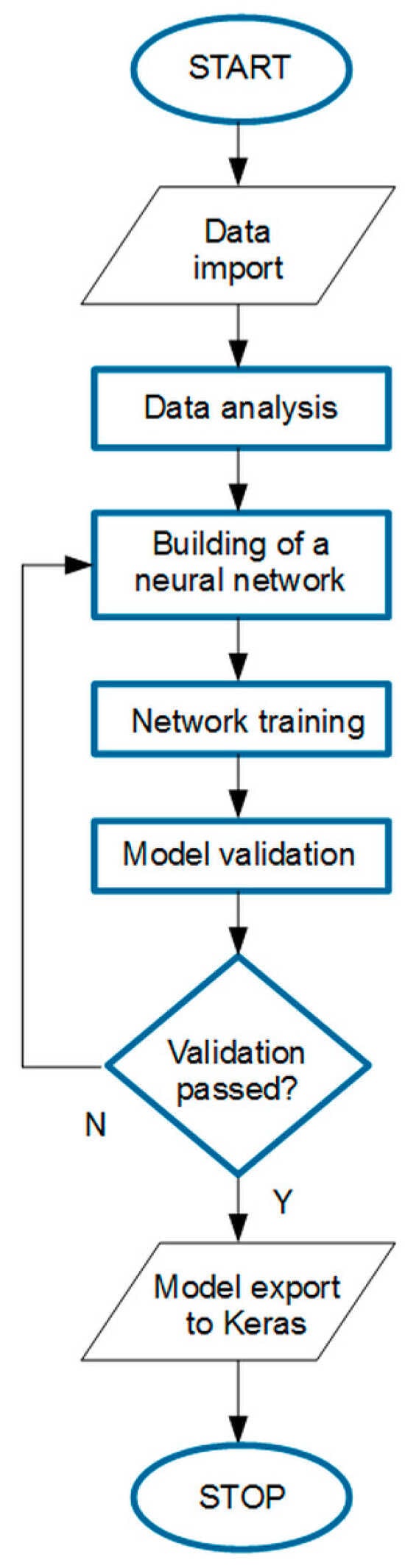 The data analysis as well as the entire process of creating the neural network was carried out using the Python language, which is clear and versatile. The availability of numerous libraries, add-ons and modules, which enable simple work with data, makes this language commonly used in many industrial and scientific applications. As an open-source product, it is readily used on all available platforms, such as Windows, Linux and McOS. Python is a high-level language, which makes the programme code created concise, clear and, therefore, easy and understandable for the user.