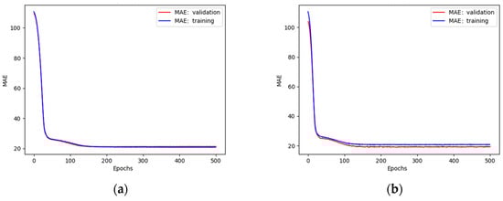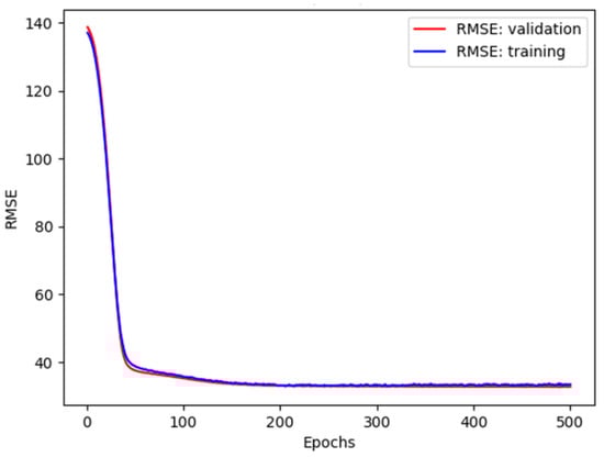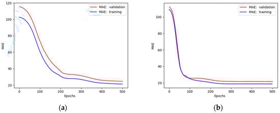 The layers added to the model are dense (dense) layers. The first and the second dense layers have 64 units (neurons, i.e., k = 64 in Figure 11) and use the Rectified Linear Unit (ReLu) activation functions [45]. The last dense layer has 1 unit, suggesting that the model is intended for regression (predicting continuous values). In this layer, the activation function was not defined, which resulted in a full range of values at the output. If the sigmoid function was used, the values generated would be in the range 0–1, and it would require an additional transformation to a range appropriate for the forecasted parameter.