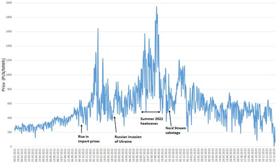 The last few years have shown directly how many factors influence energy prices and how unpredictable this market can be (Figure 2). The 3-year period chosen for the study (1 January 2021–31 December 2023) includes many phenomena of a random nature (black swans) like the conflict in Ukraine, diversions on the Nord Stream 1 and Nord Stream 2 pipelines, the embargo on coal imports from Russia, the introduction of the Fit for 55 rules in Europe, an intervention in imports of energy fuels, etc., which have a significant impact on energy prices (see also [58]).