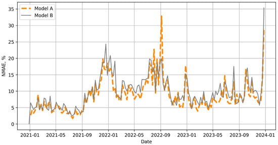 The magnitude of individual errors proportionally affects the value of the NMAE. The measure is standardized by the average of the absolute values of electricity prices from the selected period of market operation, which practically excludes values close to or equal to zero.