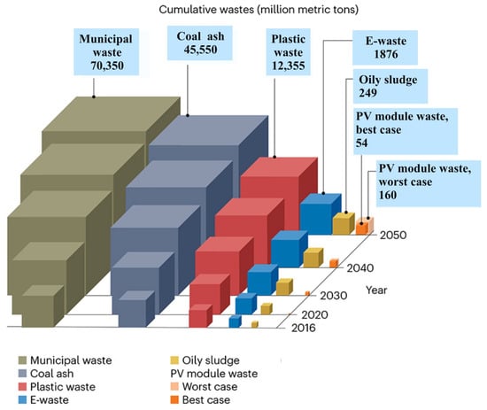 Best-case and worst-case scenario PV module waste projections from 2016 to 2050 with other waste streams (in million metric tons) [,,,,,,].