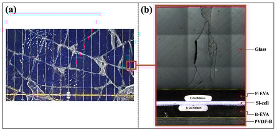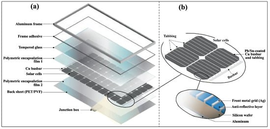 Structure of silicon-based photovoltaic (PV) panels: (a) main layers of a PV panel; (b) detailed view of solar cell components, reprinted with permission from [].