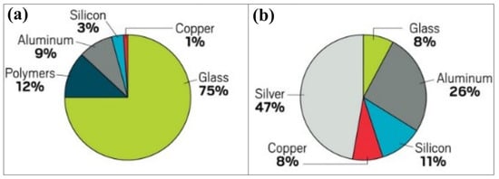 Distribution of materials in a typical silicon photovoltaic panel: (a) by mass and (b) by value [].
