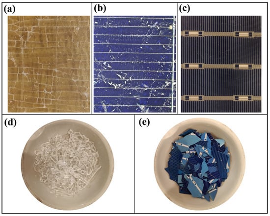 (a) Separated glass. (b) Front surface of the treated silicon cells. (c) Backside of the silicon cells. (d) Glass after thermal treatment. (e) Si cell after thermal treatment.