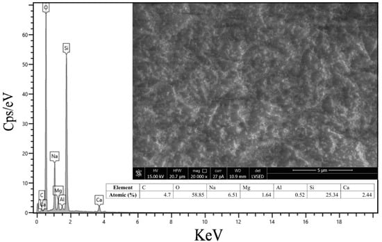 The morphology and elemental composition of the obtained glass material were analyzed using SEM and EDS, as shown in Figure 7. The SEM image shows a uniform granular texture, indicating that the treated surface of the obtained glass has no visible impurities. The EDS analysis confirms that the elemental composition of the obtained glass is consistent with the typical soda-lime glass used in PV modules. The high concentrations of oxygen and silicon, as well as the significant amounts of sodium and calcium, indicate that the recovered glass retains its essential structural and functional properties. These results are consistent with previous studies [,,,,].