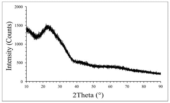 The crystalline structure of the glass was analyzed using X-ray diffraction (XRD) (Figure 8). The X-ray diffractogram showed a broad hump at 2θ values of 20–30°, confirming the amorphous nature of the glass, which is consistent with standard soda-lime glass used in photovoltaic modules. Soda-lime glass is known for its amorphous structure, which contributes to its transparency and durability [,,].