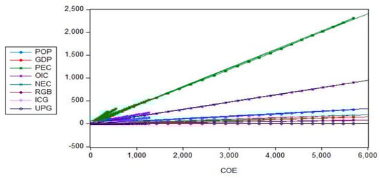 Based on the VIP analysis and the explanatory factors’ coefficients (centered coefficient and rotated coefficient), it appears that POP, GDP, PEC, OIC, NEC, and RGB are likely major contributors in determining CO2 emissions (Y). ICG and UPG have weak coefficients, which means that they have a negligible effect on the efficiency coefficient for CO2 emissions. The following observations are made in light of the anticipated analysis of this study: Although numerous recent studies have shown that urbanization increases energy consumption, some have argued that it can reduce energy consumption by promoting the efficient use of public infrastructure []. It is less clear which types of energy are likely to be affected by urbanization. The recent trend toward using more of this form of energy, especially for power generation in large cities, raises the question of whether urbanization may enhance the use of renewable energy []. Therefore, policymakers must investigate the effects of urbanization on disaggregated energy use in terms of renewable and non-renewable sources []. OECD’s Outlook modeling suggests that if poor nations were to stop subsidizing fossil fuels, global energy-related greenhouse gas emissions might be reduced by 6%. This study demonstrates that for every 1% movement in CO2 emissions, there is a corresponding 0.0127 shift in POP (0.0165–0.038), with a correlation of 0.932. An increase in PEC, OIC, and NEC affects CO2 emissions and pushes further energy consumption, as seen above, illustrating a relationship between energy use and economic growth. Long-term efforts boosting energy efficiency and moving focus to sources like solar, wind, and biomass as well as nuclear power may, thus, have an influence []. The data imply that energy consumption is the dominant driver of CO2 emissions; however, construction, transportation, and technical progress are all contributors. As a result, effective energy use policies and shifting to renewable energy, biomass, and nuclear could have long-term effects [].