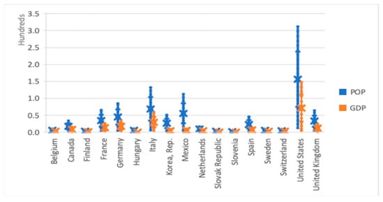 Figure 2 shows the GDP per capita in OECD countries in comparison to the population size of those countries. In spite of a growing population, the GDP per person in the United States climbed by 9.49% during 2014. The US population expanded by 3.11% between 2010 and 2014, to 327.8 million []. As a consequence, we have observed an increase in energy consumption and the concomitant changes in lifestyle that are associated with urbanization []. The OECD’s attempts to improve commercial procedures will lead to an increase in CO2 emissions. In the past and present, CO2 emissions regulation has been within the purview of the Organization for Economic Co-operation and Development (OECD) []. Between 1950 and 2016, only roughly 5–10% of global CO2 emissions were produced, whereas the rest were produced before 1950. The Structural Decomposition Analysis (SDA) model was used to analyze the shifts in Spain’s CO2 emissions, to mitigate the climate change rebound effect [].
