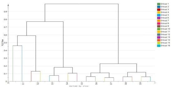 The PLS tree structure shown in Figure 3 classifies the 17 OECD countries into 16 categories. Table 2 shows the PLS tree generated by the cluster analysis, and X and Y perform the scaling analysis. We analyzed a total of 41.17% of the total population in the group 2 observations. This listing is ranked by the total area of the countries, with a scale of zero to one. Subsequently, the PLS tree is divided into two parts (groups 1–8 and groups 9–16) according to its size, and the two halves are distributed among 17 distinct nations. PLS model cross-validation eliminates superfluous nodes in the tree structure (Figure 3) and clusters component numbers (Table 2). We examine the X and Y matrices using the PLS method, which requires that they be scaled and centered before a PLS tree can be generated from them. Further, the cross-validations determine the total number of components for each cluster PLS model, capping off the tree. Cross-validation enables us to determine the number of components that should be included in each cluster PLS model and to trim the tree branches to that length.
