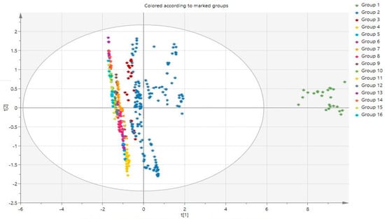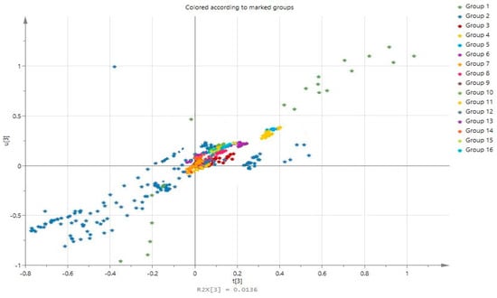 The PLS model is used to show that the data fit the model well. This research was deciphered using the same technique as the t1 vs. t2 graphic, by comparing the values of u1 and u2 in Y. Both the t1/t2 and u1/u2 scatter plots are reflected in the T2 oval plot. The T2 map displays all 16 of the possible groups, providing the ability to distribute the sample over t1 and t2. It is a two-dimensional scoring plot, where the maximum value for the Y variables is calculated based on the X data.