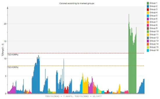 The OECD and the scatter plot are first filtered using groups in the PCA model. Principal component analysis (PCA) is a statistical method for reducing the dimensionality of a dataset while maintaining the majority of its variability []. In this research, principal component analysis (PCA) is utilized as a statistical method to simplify a dataset without losing any of its key characteristics []. In PCA, the original variables are linearly transformed into a collection of primary components that are independent of one another and account for the majority of the variance in the data. This method is most effective when applied to high-dimensional datasets, as the underlying structure may be challenging to understand and visualize []. PCA streamlines data analysis without losing any information by reducing the number of variables in the dataset. The T2 summarizes the overall score values for all 16 groups as positive numbers larger than or equal to zero, based on the group distribution. T2 = 0 characterizes the circumstance where the group’s observation is centered on the model (where all group values are averaged out). The 16-group data are transformed using SIMCA-16 into the multivariate T2 distribution, or F-distribution. Assuming that all 17 countries use the same grouping strategy, we can calculate the value below which 95% of the data will fit into the model as the lower bound of the confidence interval for T2 Figure 5. Hotelling’s T2 range at the 0.05 level of significance displays the distance from the origin of the model plane (score space). The T2 range was determined for components 1, 3, and 4. Therefore, the significance levels for T2 Hotelling fall within the range of 0.05 to 0.01. In order to be considered at the 0.05 level on this graph, a value must exceed the yellow area, while a value must exceed the red area to be considered at the 0.01 level. Consequently, the value observed in group 1 can be regarded as an outlier. If the T2-range value for 16 groups exceeds the critical restrictions, it is possible to infer the substantial separation between the two groups in the subset of components used to generate the 408 scores. Therefore, it is possible that this group is utilizing a model that was developed by other groups, as the model encompasses a very unique set of responsibilities. This suggests that the Netherlands, Spain, and Sweden have experienced economic growth as a result of their enhanced infrastructure and technology, and that economic development in countries with significant CO2 emissions is no longer a significant factor.